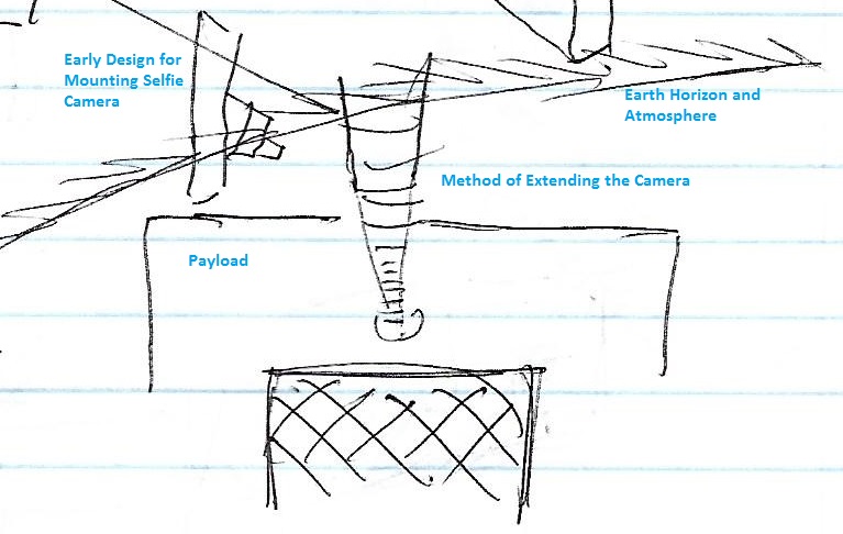 I drew this to help visualize how a payload selfie might appear. The “Early Design for Mounting Selfie Camera” (upper left) happens to be on the same piece of paper; that design grew into something very different.