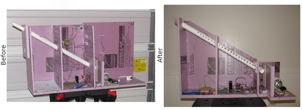 At right, the payload is shown after the weight reduction effort and before the port walls were added.